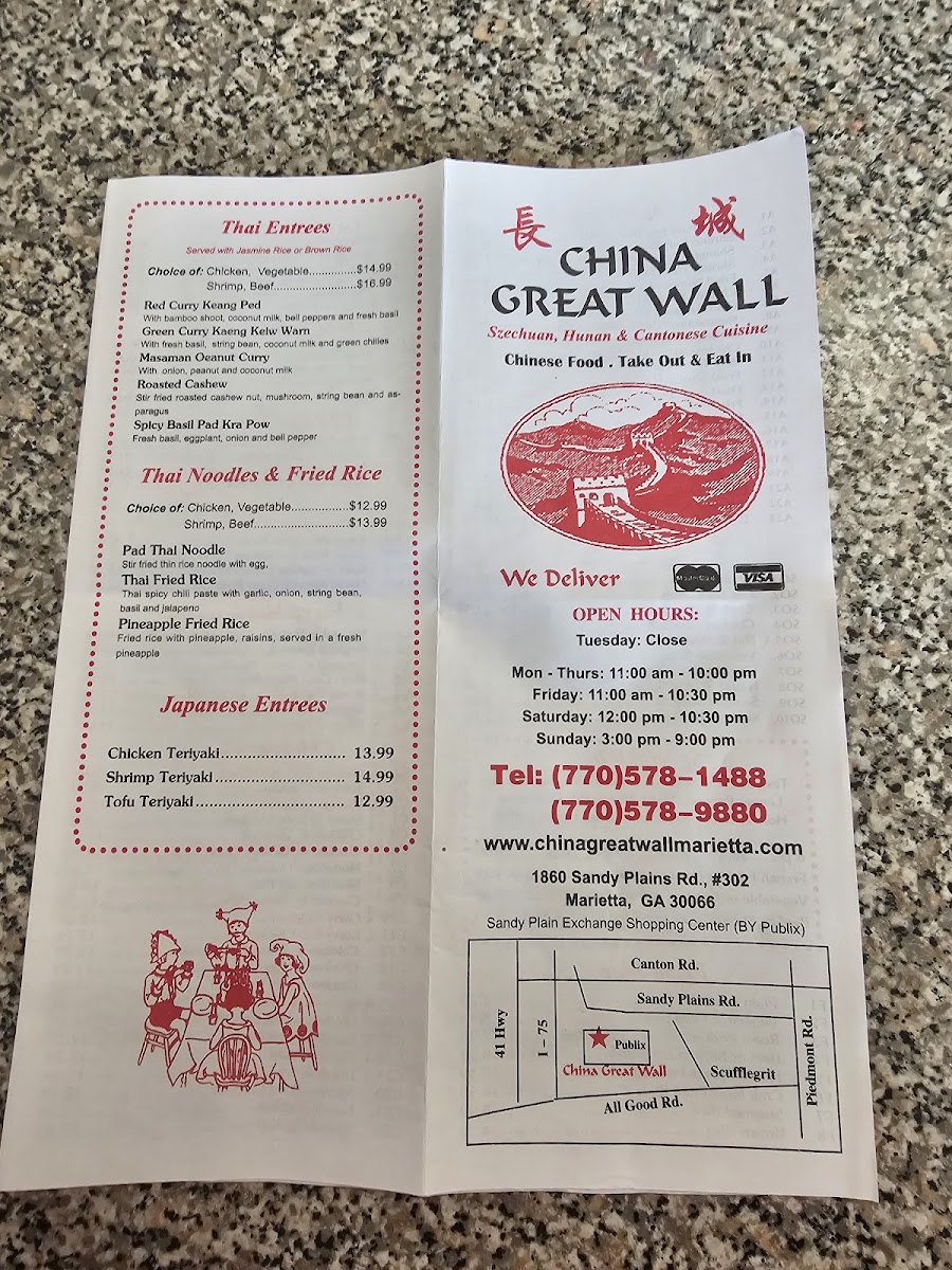 Customers rave about the savory dishes and excellent service, making it a favorite for takeout. With reasonable prices and a reliable delivery service, China Great Wall is an essential stop for anyone seeking delicious Chinese fare.