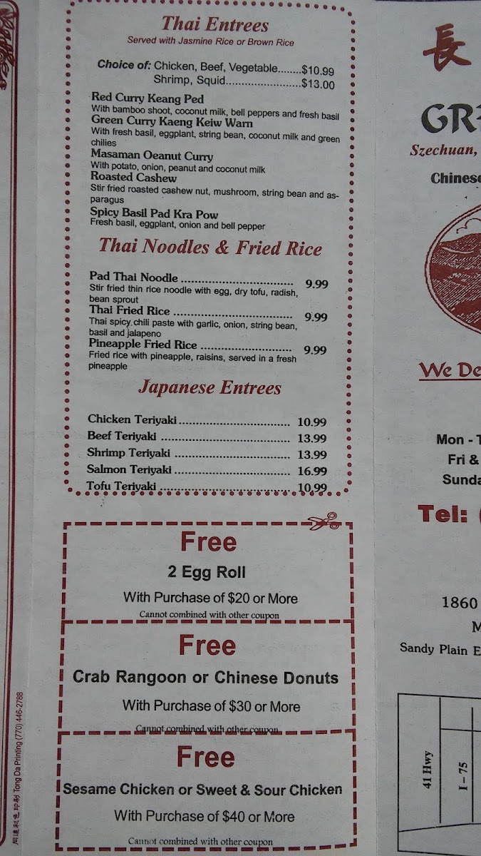 Introducing China Great Wall, a delightful haven for Chinese cuisine located at 1860 Sandy Plains Rd in Marietta, GA. Their menu is a culinary journey, featuring an array of all-day appetizers like the crispy Roast Pork Egg Roll and the flavorful Shrimp Roll. The house specials shine, with dishes such as Shrimp Chow Mein and Chicken Lo Mein, both served with your choice of fragrant jasmine or fried rice.